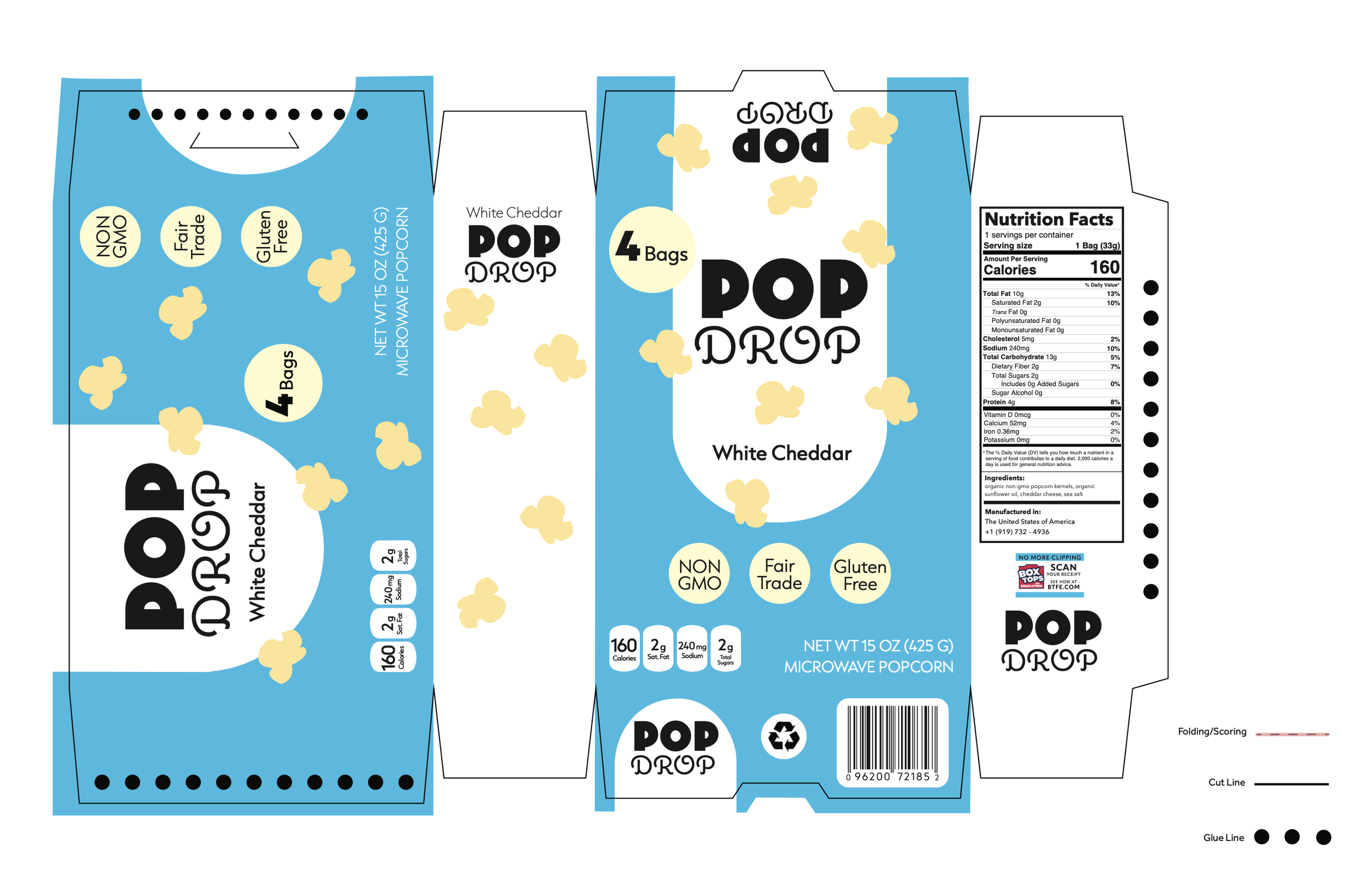 I was tasked with creating a visual identity and applying it to custom packaging for three different Pop Drop microwave popcorn box flavors.